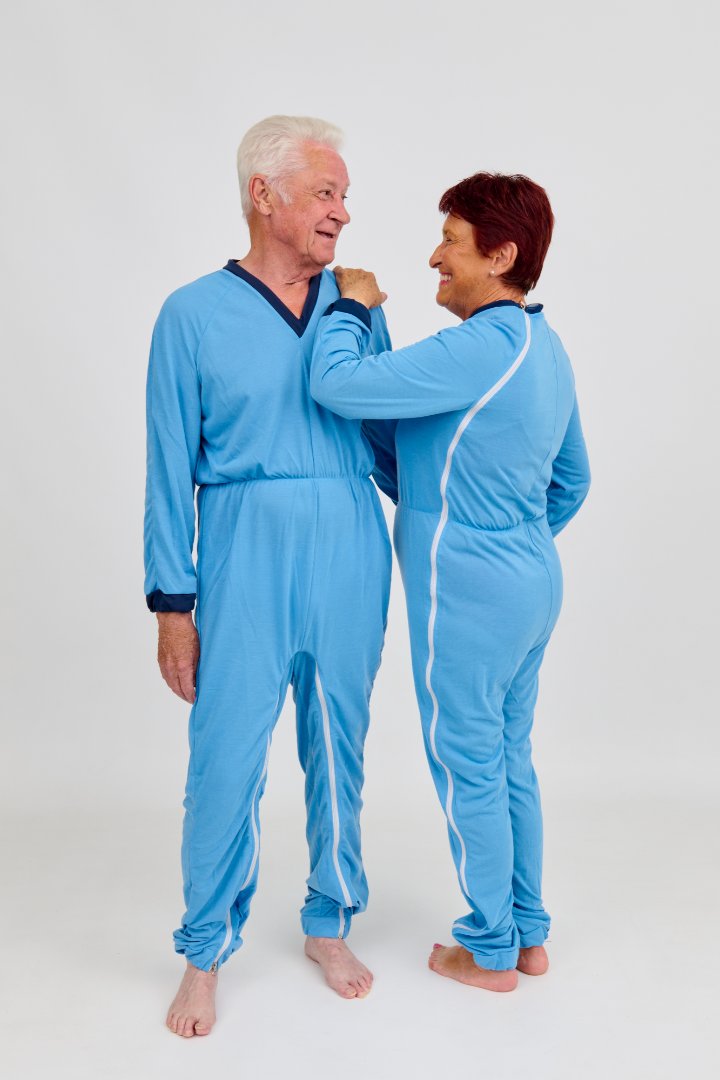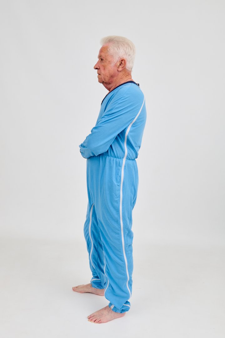 Pyjama bleu avec jambes longues et manches longues, fermeture à glissière de l'épaule à la couture latérale et entre les jambes, encolure en V, tailles de S à XXL.