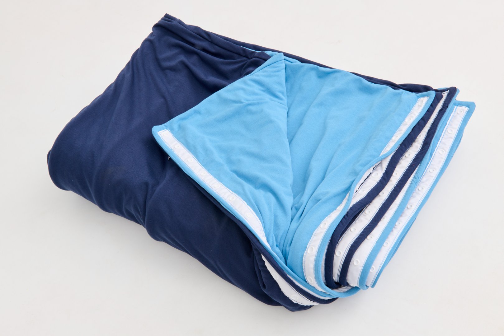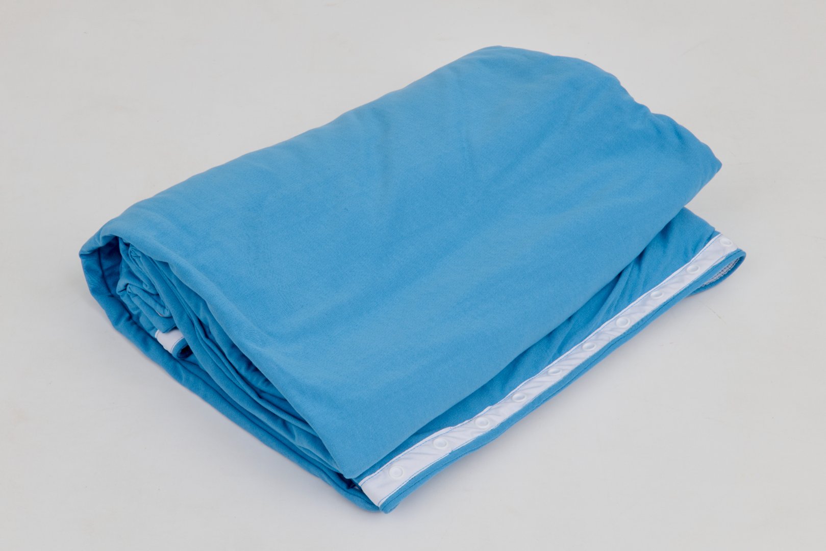 - Md 40332+/4TS: Verzwaringsdeken in kwal. 1010 licht blauw, afm. 140/200 cm, gewicht 4 kg, drukknooplint aan beide zijden aan de zijkanten.